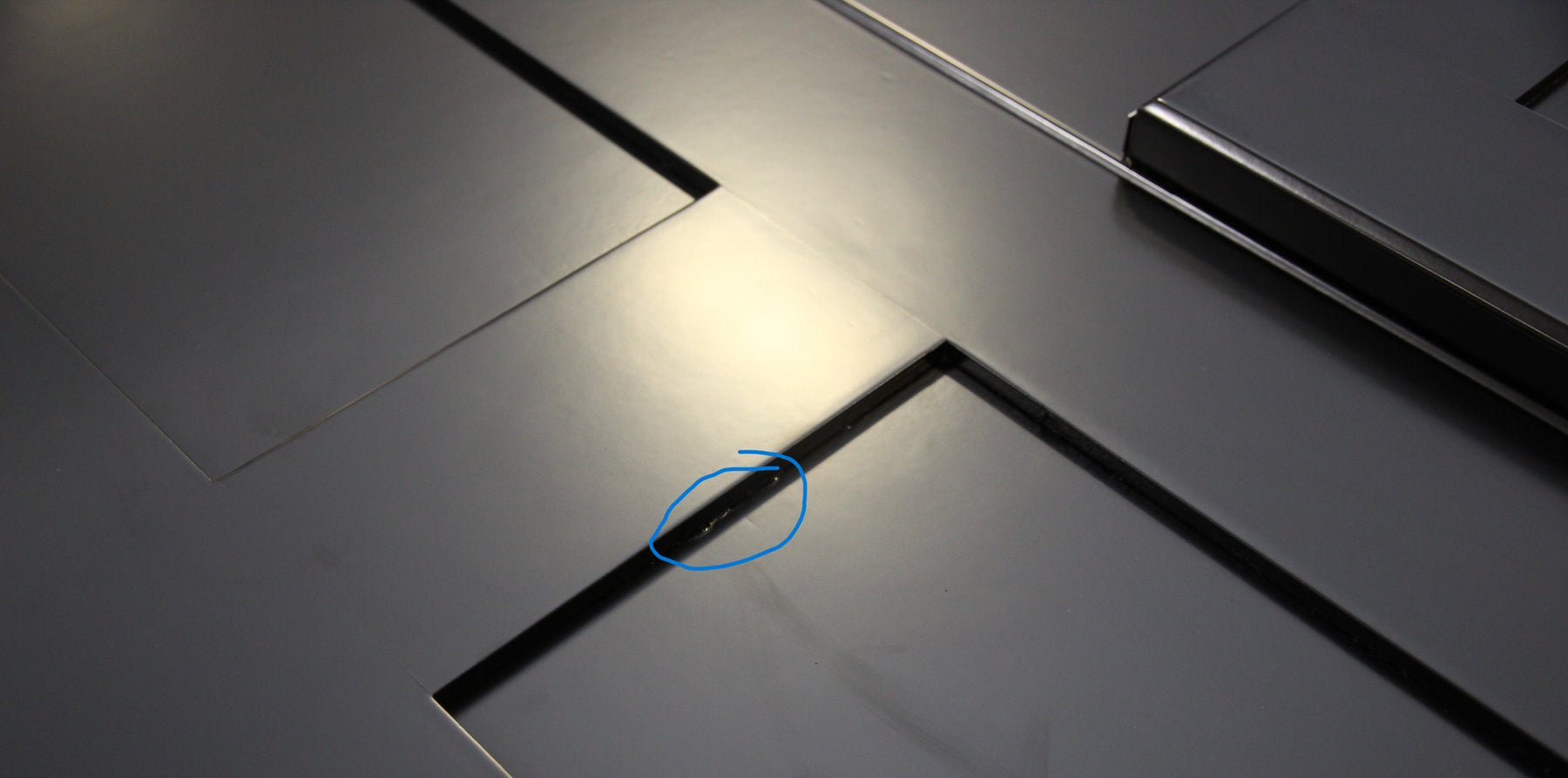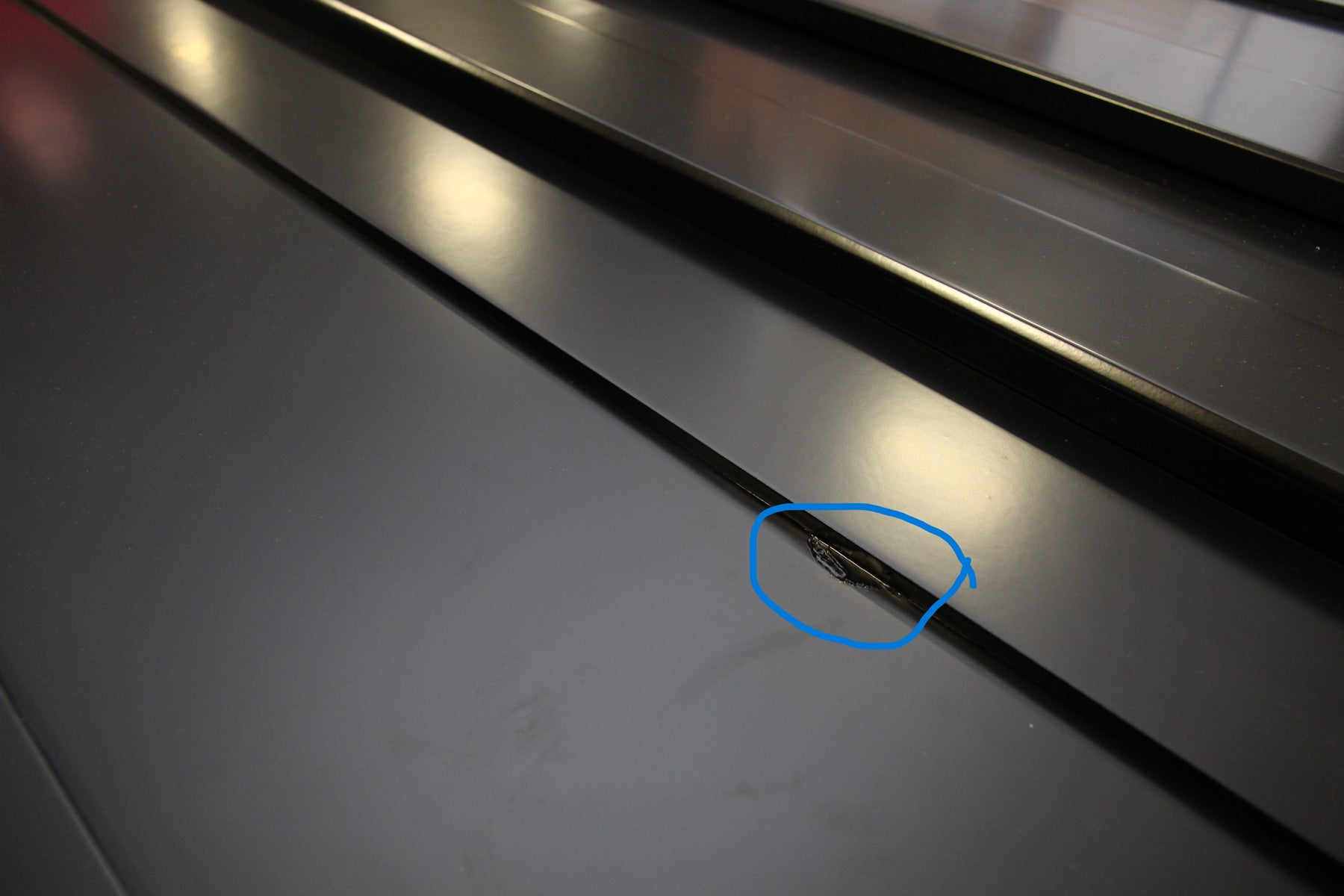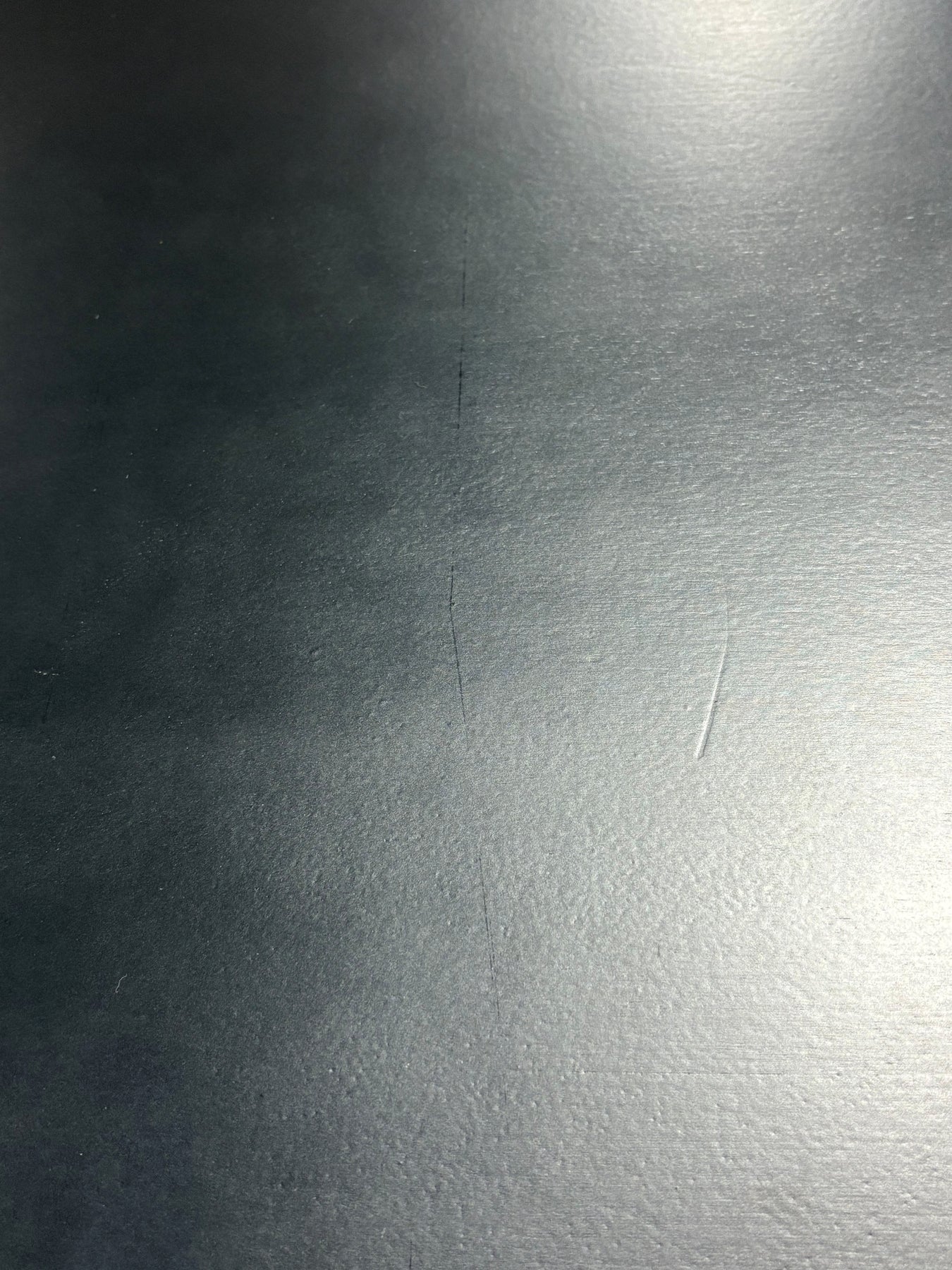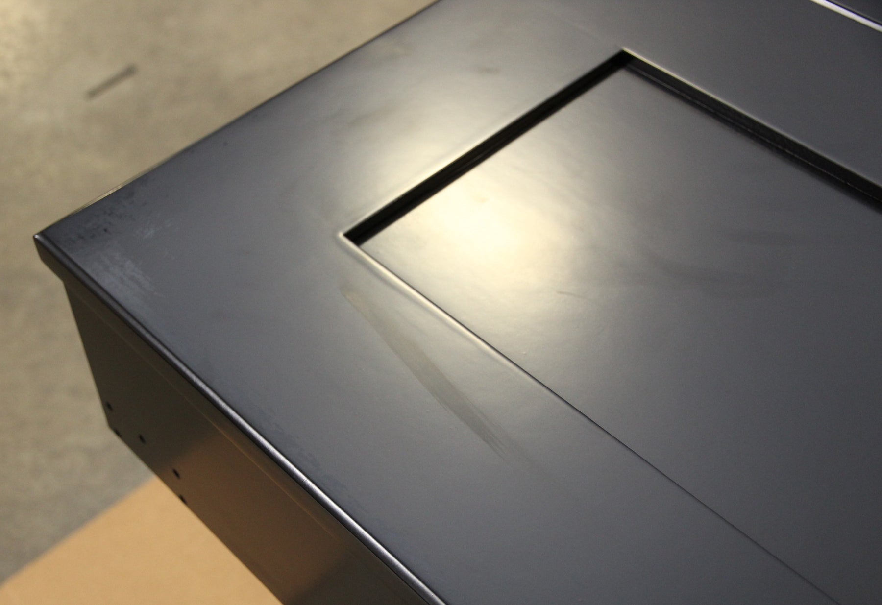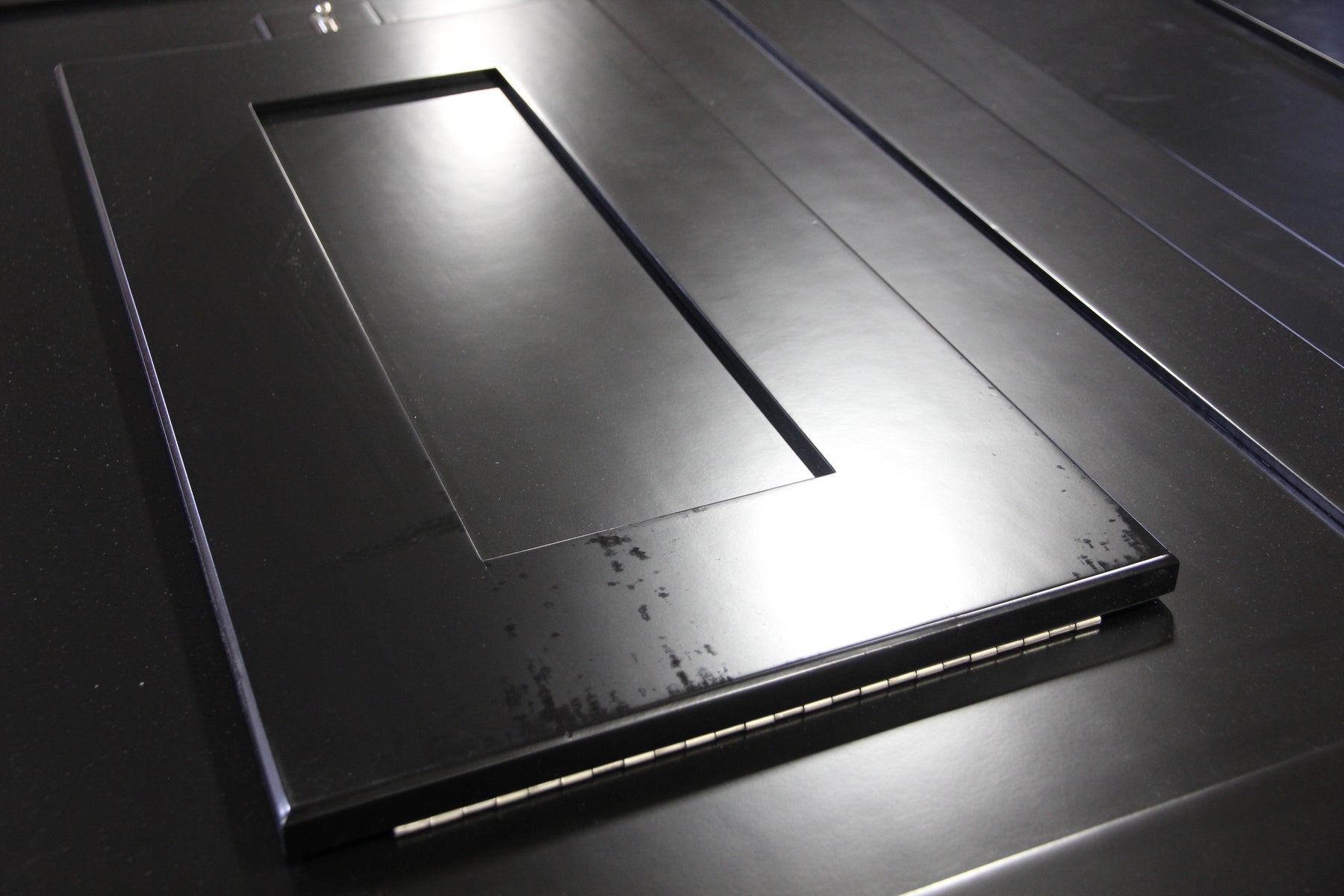 Vertical Queen Table Face Murphy Bed. This bed is built from Maple Wood and finished with our Black Pigmented Lacquer Paint with Brushed Chrome Contemporary Handles with Standard Crown. Baseboard notch is 5" x 1". THIS BED HAS BLEMISHES LOCATED ON THE OUTSIDE OF THE LEFT SIDE VERTICAL AND A VENEER SPLIT DOWN THE MIDDLE OF THE LEFT SIDE VERTICAL. THERE IS ALSO A BLEMISH LOCATED ON THE LEFT SIDE OF THE BED FACE. THERE ARE MULTIPLE RUB MARKS LOCATED ON ENTIRE BED FACE. THE TABLE LATCH IS SLIGHTLY OFF, BUT STILL LATCHES(SEE PICS BELOW). This bed is NEW and READY TO SHIP! sku#143-558