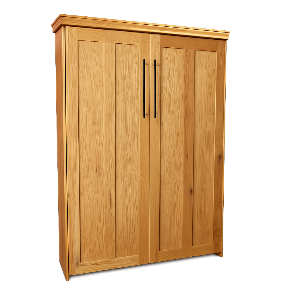 Vertical Queen Contemporary Face Murphy Bed. This bed is built from Oak Wood and finished with our Golden Oak stain color with Black Contemporary handles along with our Standard Crown. Baseboard notch is 5" x 1".This bed is NEW and READY TO SHIP MAY 4th! (overstock) sku#143-937